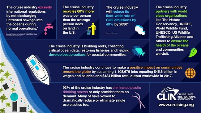 Below is a snapshot provided by CLIA on the positive sustainability efforts made by the cruise industry. For more information visit: https://cruising.org/sustainability